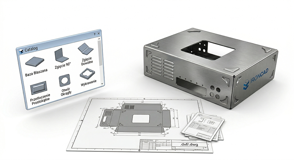 Projektowanie skomplikowanych elementów blaszanych w IRONCAD jest łatwe, intuicyjne i szybkie dzięki metodzie przeciągnij i upuść. Oprogramowanie zawiera wbudowany katalog podstaw blaszanych, zgięć, przetłoczeń i otworów, a także dedykowane funkcje automatyzujące modelowanie 3D blach. Możliwość uzyskania płaskich rozwinięć 2D z liniami gięcia, plików .dxf/.dwg oraz profesjonalnej dokumentacji technicznej sprawia, że IRONCAD jest idealnym oprogramowaniem do obróbki blach.